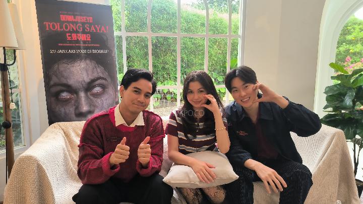 Pemeran film Tolong Saya! (Dowajuseyo), Dito Darmawan, Saskia Chadwick, dan Kim Geba saat ditemui pada Selasa, 13 Januari 2026 di Jakarta Selatan.TEMPO/Cahya Saputra