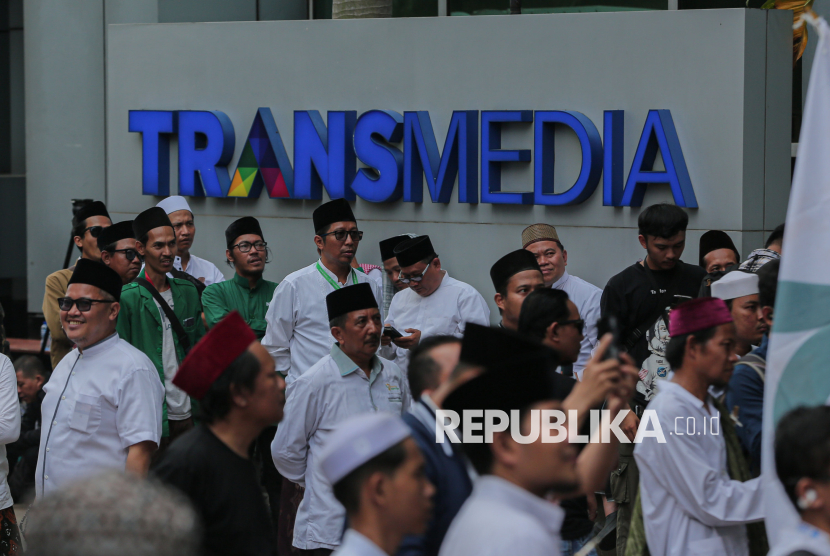 Massa dari Pengurus Wilayah Nahdlatul Ulama (PWNU) DKI Jakarta dan sejumlah alumni pondok pesantren saat Aksi Bela Ulama dan Pesantren di depan gedung Transmedia, Jakarta, Rabu (15/10/2025). Dalam aksinya mereka menuntut pihak Trans7 untuk bertanggung jawab atas tayangan program Xpose Uncensored pada tanggal 13 Oktober di stasiun televisi Trans7 yang dianggap melecehkan tradisi pondok pesantren, santri, dan para kiai. (FOTO : Republika/Thoudy Badai)