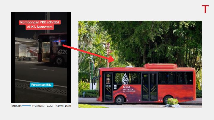 At the 19-second mark, a bus labeled "G20 Bali" appears, which was one of 30 electric buses used for the summit, as previously reported by Tempo. This series of verifications confirms that the circulating video is footage from the G20 Summit in Nusa Dua, Bali, in November 2022.
