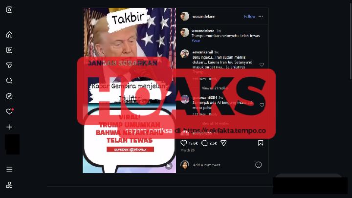 TEMPO.CO, Jakarta - An Instagram post [archived] on March 21, 2026, claimed that U.S. President Donald Trump had announced the death of Prime Minister Benjamin Netanyahu.