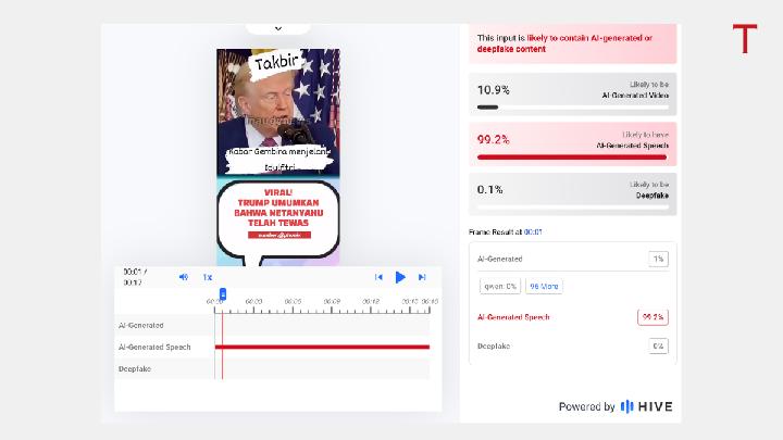 Tempo also tested the video using the Hive Moderation tool. The result showed that Hive assigned a 99.2 percent probability score that the voice in the video was generated by AI.