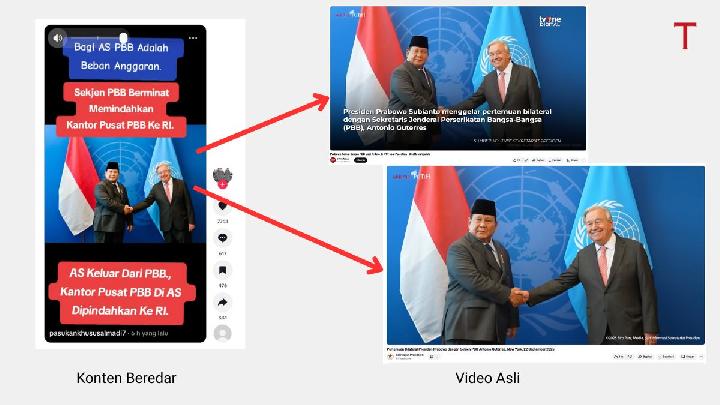 The content featured a photo of President Prabowo shaking hands with UN Secretary-General António Guterres. The content spread a narrative that the UN Secretary-General was interested in relocating the headquarters from New York to Indonesia. The uploader claimed this planned move was a consequence of the United States' withdrawal from the UN.