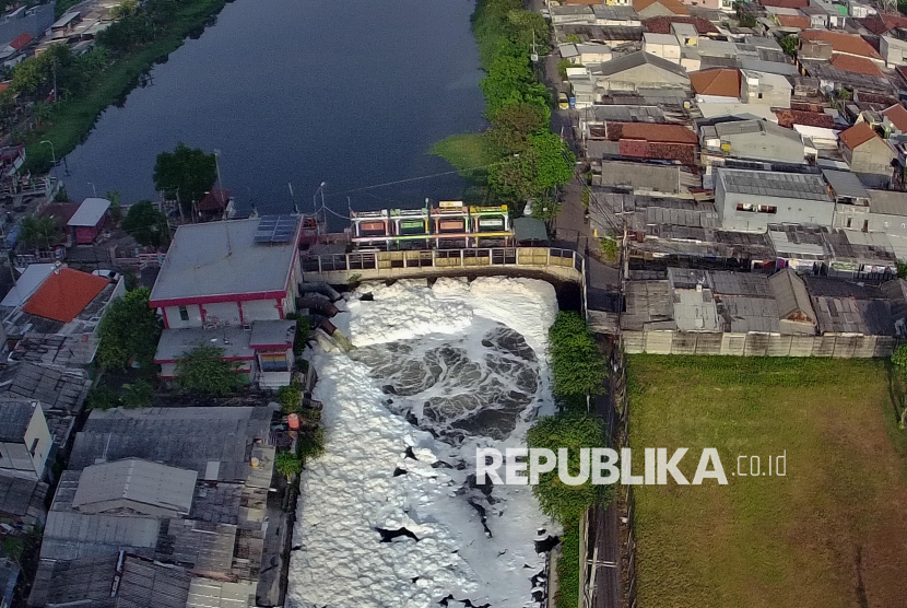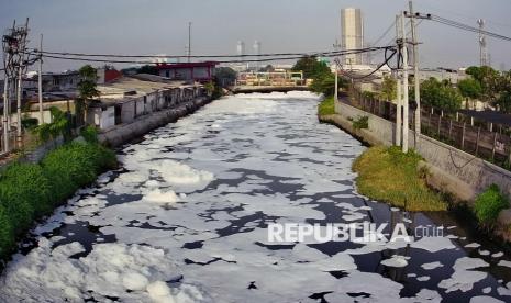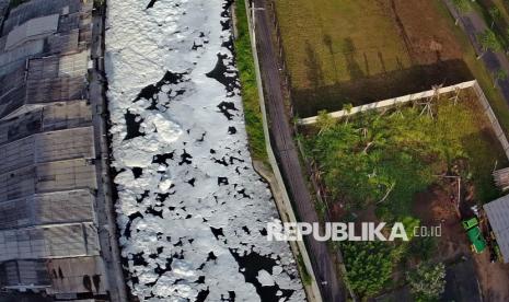 Gumpalan busa putih yang muncul di permukaan sungai tersebut diduga karena pencemaran limbah.