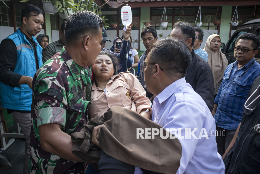 REPUBLIKA.CO.ID, BANDUNG BARAT -- Anggota TNI bersama petugas kesehatan mengevakuasi siswa yang diduga keracunan hidangan makan bergizi gratis (MBG) di SMPN 1 Cisarua, Cisarua, Kabupaten Bandung Barat, Jawa Barat, Selasa (14/10/2025).
