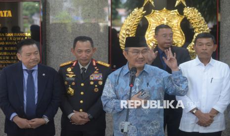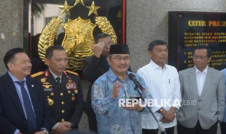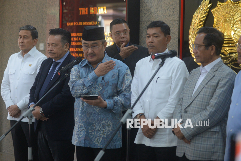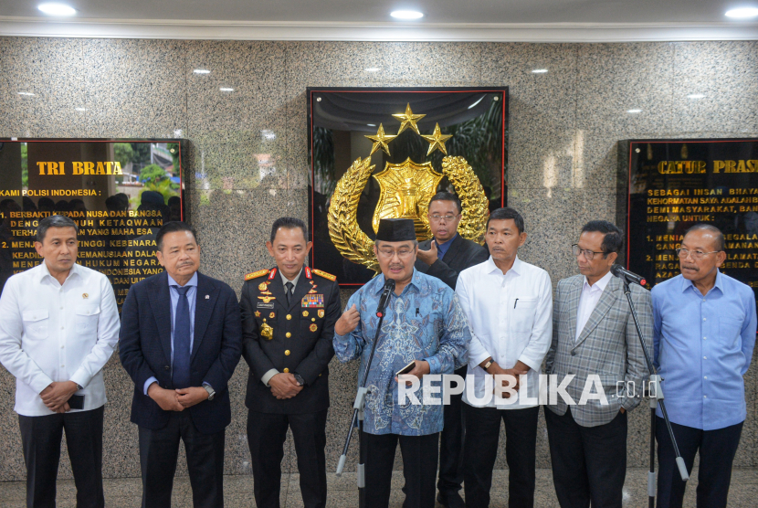 Ketua Komisi Percepatan Reformasi Polri Jimly Asshiddiqie, bersama para anggotanya memberikan keterangan pers usai melakukan rapat perdana di Mabes Polri, Jakarta, Senin (10/11/2025). Rapat perdana tersebut membahas rencana serta target teknis yang akan dilakukan komisi selama tiga bulan ke depan. Komisi Percepatan Reformasi Polri sepakat akan menggelar rapat rutin setiap pekan. Rapat mingguan itu akan membahas capaian dan rencana tindak lanjut setiap bidang reformasi yang menjadi fokus komisi. (FOTO : Republika/Prayogi)