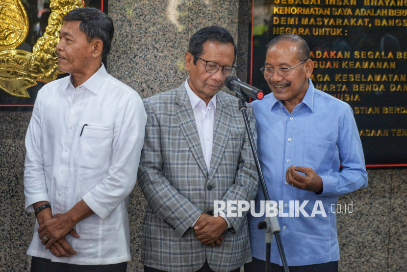 Anggota Komisi Percepatan Reformasi Polri Idham Aziz, Mahfud MD dan Badrodin Haiti berbincang sebelum memberikan keterangan pers usai melakukan rapat perdana di Mabes Polri, Jakarta, Senin (10/11/2025). Rapat perdana tersebut membahas rencana serta target teknis yang akan dilakukan komisi selama tiga bulan ke depan. Komisi Percepatan Reformasi Polri sepakat akan menggelar rapat rutin setiap pekan. Rapat mingguan itu akan membahas capaian dan rencana tindak lanjut setiap bidang reformasi yang menjadi fokus komisi. (FOTO : Republika/Prayogi)