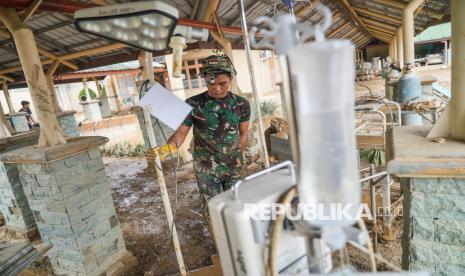 Prajurit TNI menata alat-alat kesehatan di area RSUD Aceh Tamiang yang luluh lantak akibat banjir di Kabupaten Aceh Tamiang, Aceh, Sabtu (6/12/2025). Berdasarkan data BPBD setempat hingga Sabtu (6/12), banjir bandang mengakibatkan 57 warga Aceh Tamiang meninggal dunia dan 23 warga hilang, sementara berdasarkan data BNPB bencana banjir dan tanah longsor di Sumatra mengakibatkan 916 orang meninggal dunia dan 274 orang hilang. (FOTO : ANTARA FOTO/Erlangga Bregas Prakoso)