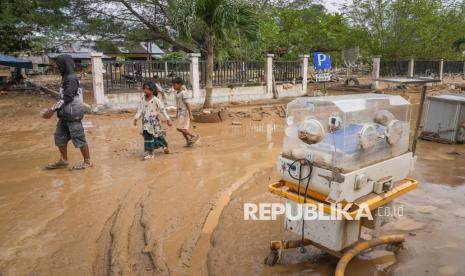 Warga melintas di RSUD Aceh Tamiang luluh lantak akibat banjir di Kabupaten Aceh Tamiang, Aceh, Sabtu (6/12/2025). Berdasarkan data BPBD setempat hingga Sabtu (6/12), banjir bandang mengakibatkan 57 warga Aceh Tamiang meninggal dunia dan 23 warga hilang, sementara berdasarkan data BNPB bencana banjir dan tanah longsor di Sumatra mengakibatkan 916 orang meninggal dunia dan 274 orang hilang. (FOTO : ANTARA FOTO/Erlangga Bregas Prakoso)