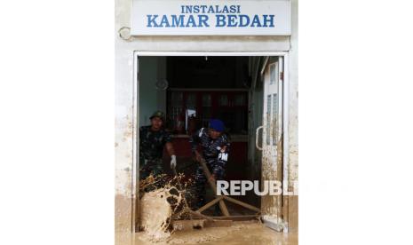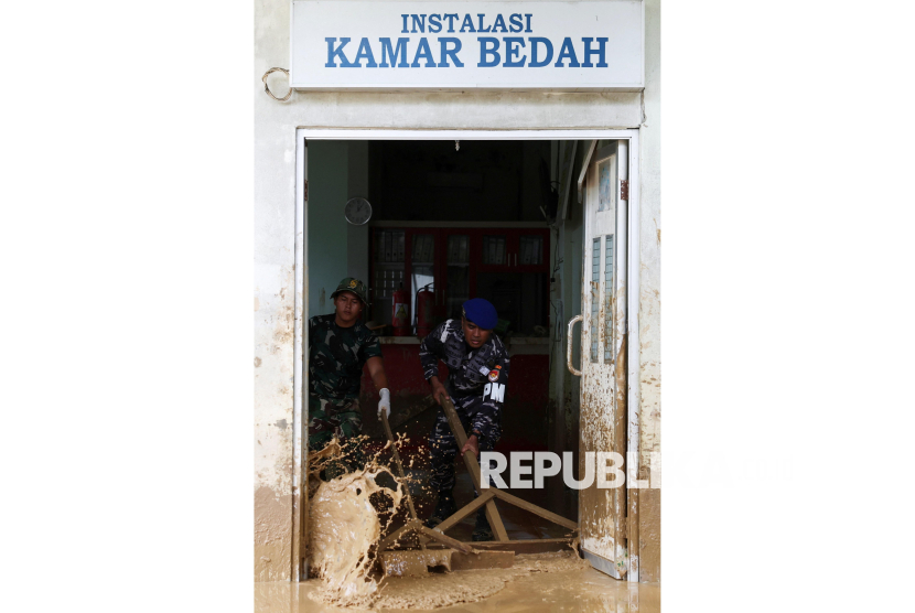 Prajurit TNI membersihkan area RSUD Aceh Tamiang yang luluh lantak akibat banjir di Kabupaten Aceh Tamiang, Aceh, Ahad (7/12/2025). Berdasarkan data BPBD setempat hingga Sabtu (6/12), banjir bandang mengakibatkan 57 warga Aceh Tamiang meninggal dunia dan 23 warga hilang, sementara berdasarkan data BNPB bencana banjir dan tanah longsor di Sumatra mengakibatkan 916 orang meninggal dunia dan 274 orang hilang. (FOTO : REUTERS/Ajeng Dinar Ulfiana)