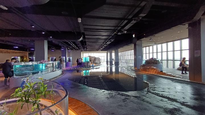 Di zona lain, ubur-ubur melayang dalam pencahayaan redup, dipadukan dengan proyeksi digital. Ada pula area penguin, yang bisa diamati dari bawah saat berenang. Salah satu instalasi yang menonjol adalah tangki hiu transparan 360 derajat yang menggabungkan tampilan nyata dan visual digital.