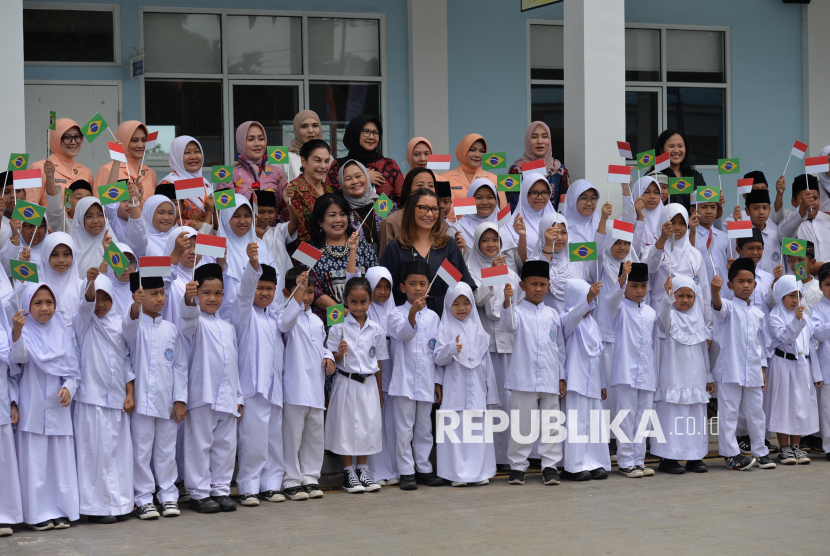 REPUBLIKA.CO.ID, JAKARTA -- Ibu Negara Brasil Janja Da Silva berfoto bersama dengan siswa seusai melihat proses Makan Bergizi Gratis (MBG) di SD Angkasa 05 Halim, Jakarta, Jumat (24/10/2025).
