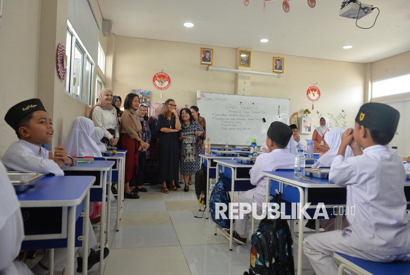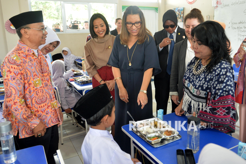 Ibu Negara Brasil Janja Lula da Silva (kedua kanan) melihat pelaksanaan program Makan Bergizi Gratis (MBG) di SD 05 Angkasa, Halim, Jakarta, Jumat (24/10/2025). Dalam Kunjungan kenegaraannya, Ibu Negara Brasil Janja Da Silva melihat proses pelaksanaan program MBG. (FOTO : Edwin Putranto/Republika)