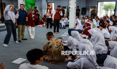Menteri Sosial Saifullah Yusuf (kelima kiri) bersama Wakil Menteri Sosial Agus Jabo (keempat kiri) dan Sekretaris Kabinet yang juga Duta Sekolah Rakyat Teddy Indra Wijaya (kedua kiri) berbincang dengan siswa saat pentas seni sekolah rakyat di Sekolah Rakyat Menengah Atas (SRMA) 33 Tangerang Selatan, Banten, Ahad (19/10/2025). Kegiatan tersebut sebagai ajang unjuk bakat peserta didik guna mengenali potensi minat pada bidang seni budaya dan pembangunan karakter siswa. (FOTO : ANTARA FOTO/Putra M. Akbar)