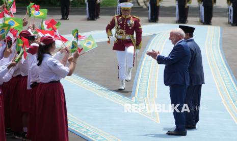 Presiden Prabowo Subianto bersama Presiden Brasil Luiz Inacio Lula da Silva (kanan) menyapa para pelajar usai pemeriksaan pasukan di Istana Merdeka, Jakarta, Kamis (23/10/2025). Presiden Prabowo Subianto menerima kunjungan Presiden Brasil Luiz Inacio Lula da Silva guna membahas isu-isu global dan bilateral termasuk penguatan kerja sama kedua negara di sejumlah bidang. (FOTO : AP Photo/Achmad Ibrahim)