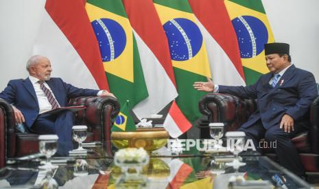 Presiden Prabowo Subianto (kanan) berbincang dengan Presiden Brasil Luiz Inacio Lula da Silva (kiri) saat pertemuan di Istana Merdeka, Jakarta, Kamis (23/10/2025). Presiden Prabowo Subianto menerima kunjungan Presiden Brasil Luiz Inacio Lula da Silva guna membahas isu-isu global dan bilateral termasuk penguatan kerja sama kedua negara di sejumlah bidang. (FOTO : ANTARA FOTO/Muhammad Adimaja)
