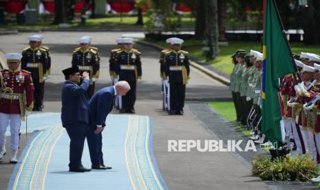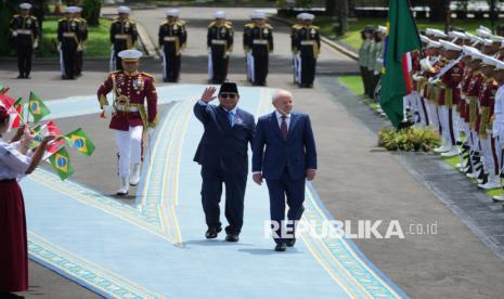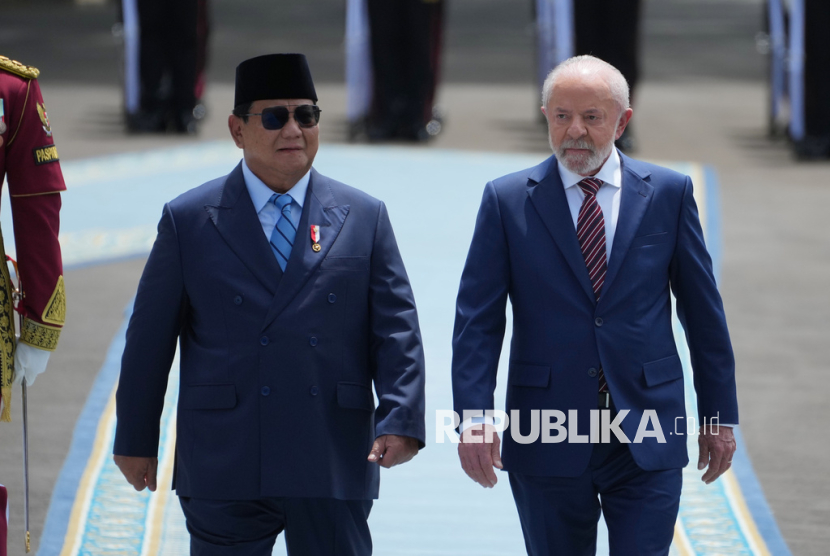 Presiden Prabowo Subianto bersama Presiden Brasil Luiz Inacio Lula da Silva berjalan untuk pemeriksaan pasukan di Istana Merdeka, Jakarta, Kamis (23/10/2025). Presiden Prabowo Subianto menerima kunjungan Presiden Brasil Luiz Inacio Lula da Silva guna membahas isu-isu global dan bilateral termasuk penguatan kerja sama kedua negara di sejumlah bidang. (FOTO : AP Photo/Achmad Ibrahim)