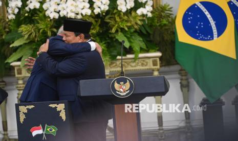 REPUBLIKA.CO.ID, JAKARTA Presiden Prabowo Subianto bersama Presiden Brasil Luiz Inácio Lula da Silva berpelukan usai menyampaikan keterangan kepada wartawan di Istana Merdeka, Jakarta, Kamis (23/10/2025).