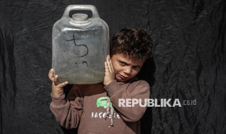 Seorang anak Palestina membawa dirigen air yang kosong di Kamp Pengungsi Bureij, Gaza, Ahad (19/10/2025). Perang dan konflik berkepanjangan di Gaza membuat anak-anak Gaza kehilangan akses pendidikan dan harus berjuang untuk bertahan hidup di pengungsian. (FOTO : Moiz Salhi/Anadolu via Reuters)