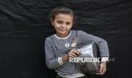 Seorang anak Palestina membawa panci kosong di Kamp Pengungsi Bureij, Gaza, Ahad (19/10/2025). Anak-anak Palestina di Gaza menghabiskan hari-hari mereka dengan menunggu dalam antrean panjang untuk mendapatkan bantuan. Mereka kehilangan akses pendidikan dan kesempatan bermain layaknya anak seusia mereka. (FOTO : Moiz Salhi/Anadolu via Reuters)