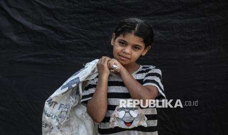 Anak Palestina membawa karung yang digunakan untuk mencari kayu bakar dan barang-barang lainnya untuk bertahan hidup di Kamp Pengungsi Bureij, Gaza, Ahad (19/10/2025). Anak-anak Gaza telah kehilangan hak dasar untuk mendapatkan pendidikan dan bermain akibat perang dan konflik berkepanjangan. (FOTO : Moiz Salhi/Anadolu via Reuters)