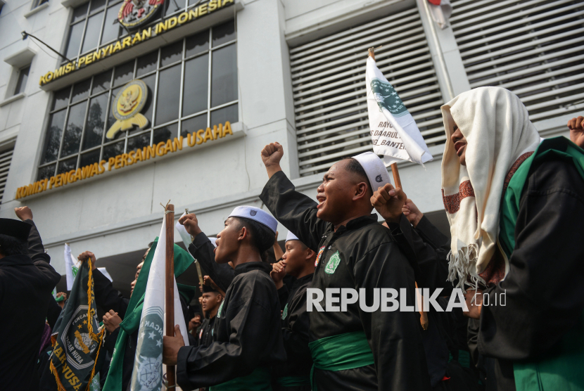 REPUBLIKA.CO.ID, JAKARTA -- Sejumlah santri mengikuti aksi damai bela kiai di depan Kantor Komisi Penyiaran Indonesia (KPI) Pusat, Jakarta, Selasa (21/10/2025).