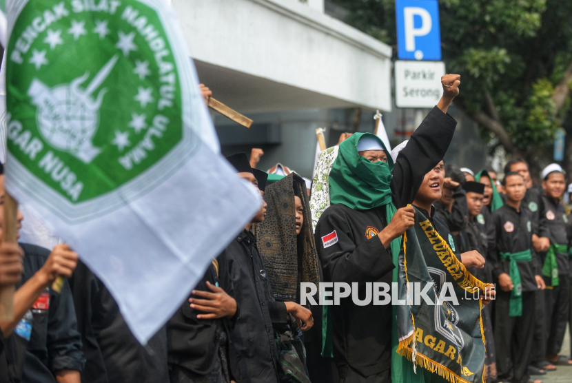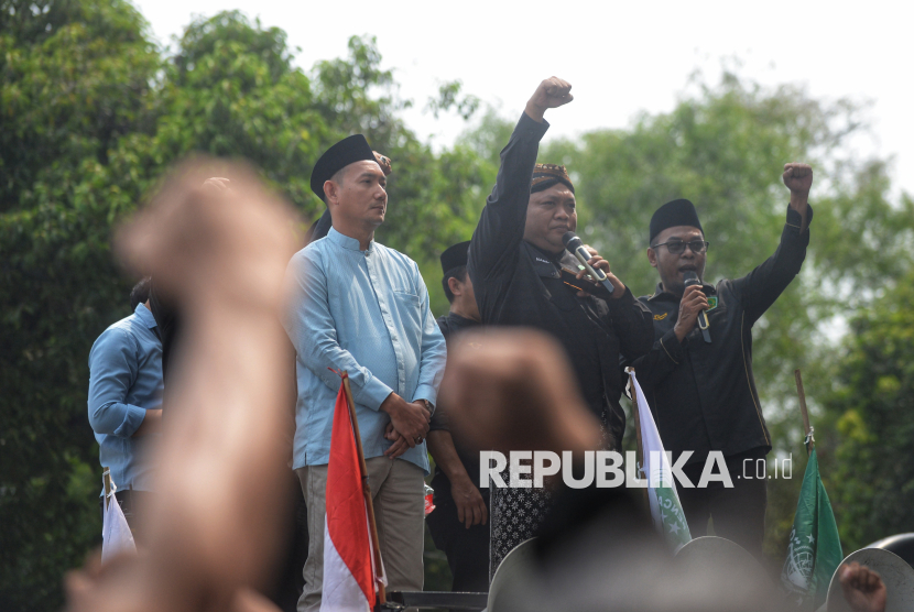 Ketua Umum Pagar Nusa Muchamad Nabil Haroen didampingi Ketua Komisi Penyiaran Indonesia (KPI) Pusat Ubaidillah saat menemui Sejumlah santri yang mengikuti aksi damai bela kiai di depan Kantor Komisi Penyiaran Indonesia (KPI) Pusat, Jakarta, Selasa (21/10/2025). Aksi tersebut digelar sebagai respons atas tayangan stasiun televisi Trans7 yang dinilai merendahkan kiai dan pesantren. (FOTO : Republika/Prayogi)