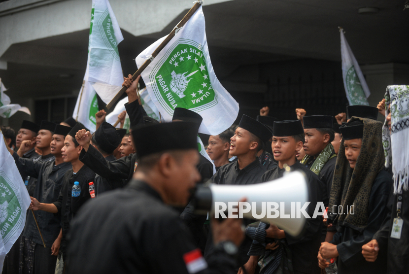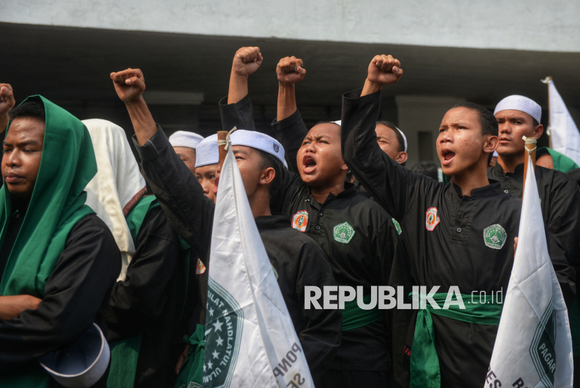 Sejumlah santri mengikuti aksi damai bela kiai di depan Kantor Komisi Penyiaran Indonesia (KPI) Pusat, Jakarta, Selasa (21/10/2025). Aksi tersebut digelar sebagai respons atas tayangan stasiun televisi Trans7 yang dinilai merendahkan kiai dan pesantren. (FOTO : Republika/Prayogi)