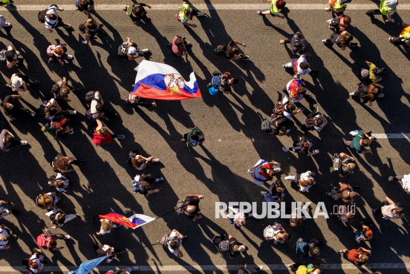 REPUBLIKA.CO.ID, SERBIA -- Para mahasiswa tiba untuk mengikuti aksi peringatan satu tahun bencana stasiun kereta yang menewaskan 16 orang, di Indjija, Serbia, Jumat (31/10/2025).