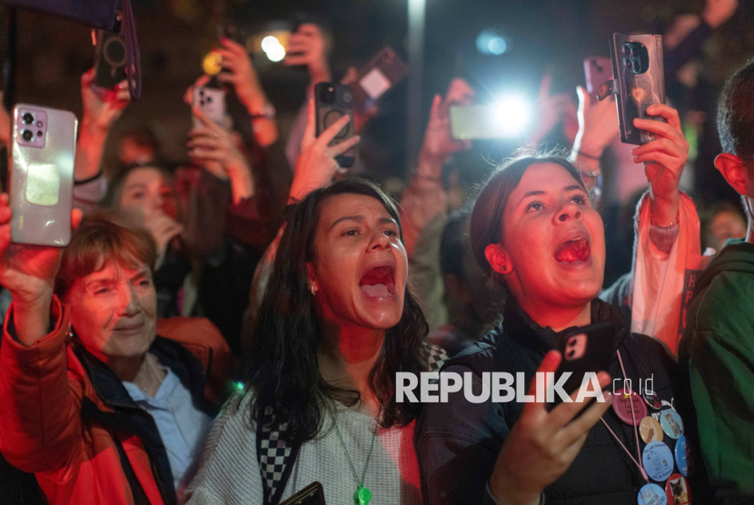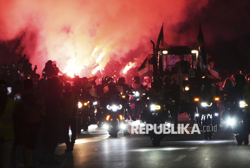 Masyarakat menyambut sekelompok pelajar dari kota Novi Pazar yang bergabung dalam unjuk rasa besar menandai peringatan bencana mematikan di stasiun kereta api, di Novi Sad, Serbia, Jumat (31/10/2025). Ribuan orang, terutama anak muda, turun ke jalan menggelar demonstrasi besar untuk menuntut pertanggungjawaban bencana stasiun kereta api yang terjadi tahun lalu, yang diduga terjadi karena korupsi pemerintah yang menyebabkan pekerjaan renovasi stasiun bermasalah. Para demonstran juga mendesak dilakukannya pemilihan umum parlemen dini untuk menggulingkan pemerintahan populis Presiden Aleksandar Vucic. (FOTO : AP Photo/Darko Vojinovic)