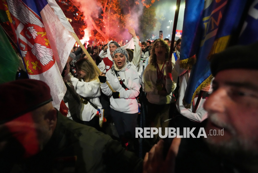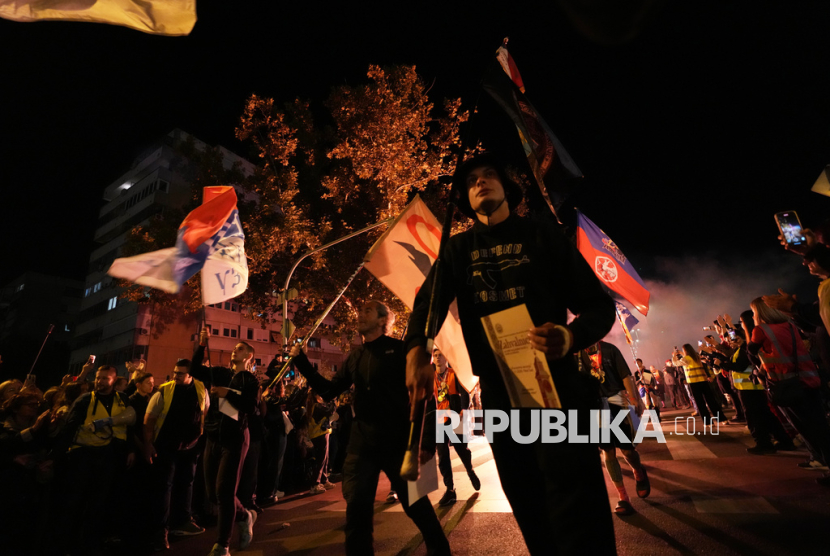 Para demonstran meneriakkan yel-yel saat mengikuti aksi peringatan satu tahun bencana stasiun kereta yang menewaskan 16 orang, di Indjija, Serbia, Jumat (31/10/2025). Ribuan orang, terutama anak muda, turun ke jalan menggelar demonstrasi besar untuk menuntut pertanggungjawaban bencana stasiun kereta api yang terjadi tahun lalu, yang diduga terjadi karena korupsi pemerintah yang menyebabkan pekerjaan renovasi stasiun bermasalah. Para demonstran juga mendesak dilakukannya pemilihan umum parlemen dini untuk menggulingkan pemerintahan populis Presiden Aleksandar Vucic. (FOTO : AP Photo/Marko Drobnjakovic)