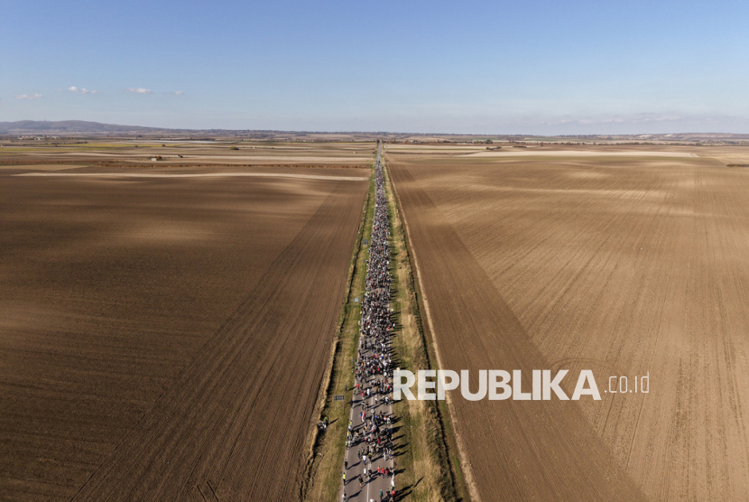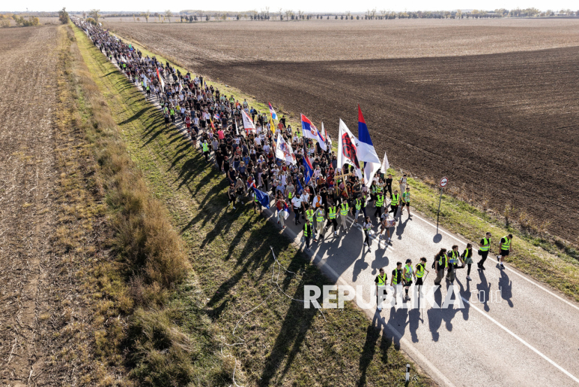 Barisan pelajar terlihat melalui ladang-ladang di Serbia utara, saat mereka pergi ke Novi Sad untuk demonstrasi besar pada 1 November guna memperingati satu tahun bencana stasiun kereta yang menewaskan 16 orang, di Indjija, Serbia, Jumat (31/10/2025). Ribuan orang, terutama anak muda, turun ke jalan menggelar demonstrasi besar untuk menuntut pertanggungjawaban bencana stasiun kereta api yang terjadi tahun lalu, yang diduga terjadi karena korupsi pemerintah yang menyebabkan pekerjaan renovasi stasiun bermasalah. Para demonstran juga mendesak dilakukannya pemilihan umum parlemen dini untuk menggulingkan pemerintahan populis Presiden Aleksandar Vucic. (FOTO : AP Photo/Armin Durgut)