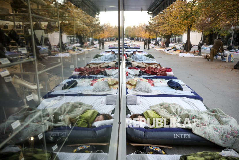 Para pelajar tidur di jalan sebelum memulai pawai mereka ke Novi Sad untuk unjuk rasa besar pada 1 November guna memperingati satu tahun bencana stasiun kereta yang menewaskan 16 orang, di Indjija, Serbia, Jumat (31/10/2025). Ribuan orang, terutama anak muda, turun ke jalan menggelar demonstrasi besar untuk menuntut pertanggungjawaban bencana stasiun kereta api yang terjadi tahun lalu, yang diduga terjadi karena korupsi pemerintah yang menyebabkan pekerjaan renovasi stasiun bermasalah. Para demonstran juga mendesak dilakukannya pemilihan umum parlemen dini untuk menggulingkan pemerintahan populis Presiden Aleksandar Vucic. (FOTO : AP Photo/Armin Durgut)