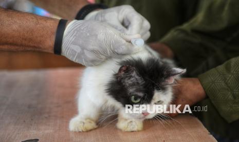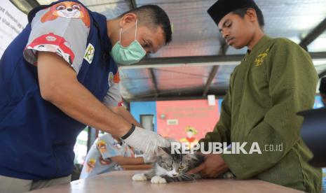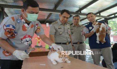 Petugas menyuntikkan vaksin rabies ke seekor kucing peliharaan di RPTRA Pesona Manggarai, Tebet, Jakarta, Selasa (14/10/2025). Kegiatan yang diselenggarakan oleh Suku Dinas Ketahanan Pangan, Kelautan, dan Pertanian (KPKP) Jakarta Selatan tersebut merupakan pemberian vaksin gratis untuk mengantisipasi penyebaran penyakit rabies, terutama pada hewan peliharaan, sekaligus menjadi upaya mempertahankan status Jakarta sebagai wilayah bebas rabies. (FOTO : Republika/Prayogi)