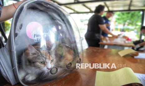 Warga membawa kucing peliharaannya untuk dilakukan vaksin rabies di RPTRA Pesona Manggarai, Tebet, Jakarta, Selasa (14/10/2025). Berdasarkan data Satuan Pelaksana Ketahanan Pangan, Kelautan, dan Pertanian (KPKP) Kecamatan Tebet, hingga September 2025 telah dilakukan vaksinasi rabies terhadap 1.233 hewan peliharaan, seperti anjing, kucing, musang, dan monyet, atau telah melampaui target sebanyak 1.228 hewan. (FOTO : Republika/Prayogi)