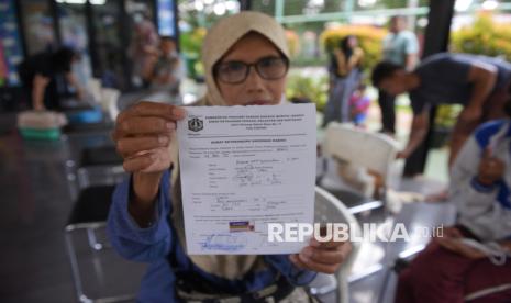 Warga menunjukkan surat keterangan telah di vaksin rabies hewan peliharaannya di RPTRA Pesona Manggarai, Tebet, Jakarta, Selasa (14/10/2025). Berdasarkan data Satuan Pelaksana Ketahanan Pangan, Kelautan, dan Pertanian (KPKP) Kecamatan Tebet, hingga September 2025 telah dilakukan vaksinasi rabies terhadap 1.233 hewan peliharaan, seperti anjing, kucing, musang, dan monyet, atau telah melampaui target sebanyak 1.228 hewan. (FOTO : Republika/Prayogi)