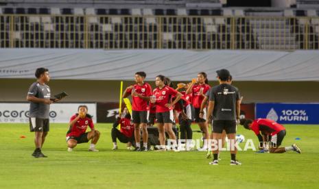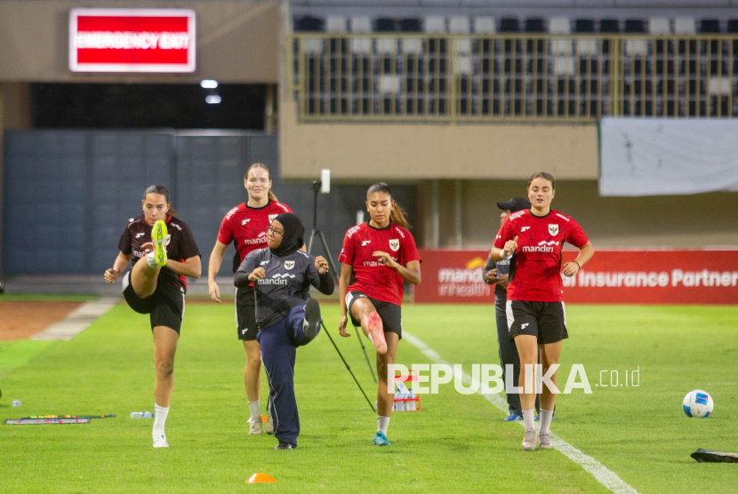 REPUBLIKA.CO.ID, SLEMAN -- Pesepak bola Timnas Putri Indonesia melakukan pemanasan saat Official Training jelang laga FIFA Women’s Match Day di Stadion Maguwoharjo, Sleman, D.I Yogyakarta, Selasa (25/11/2025).