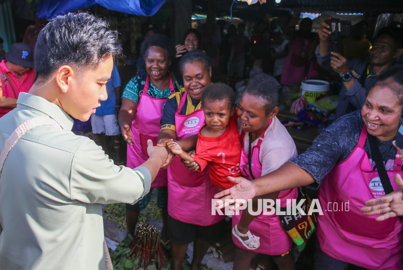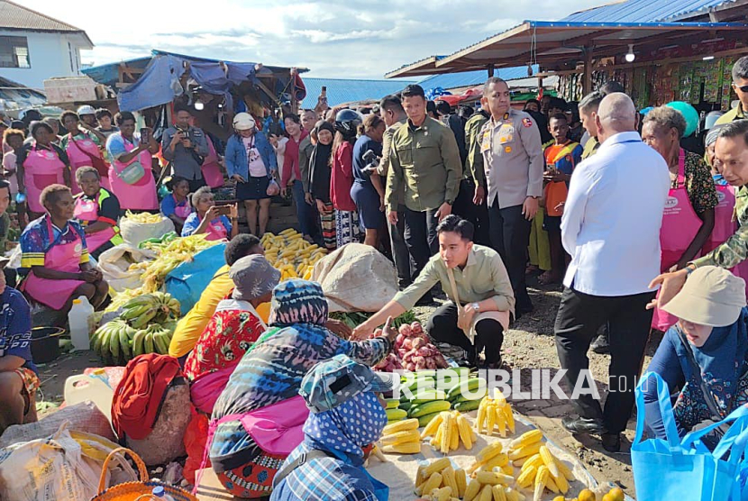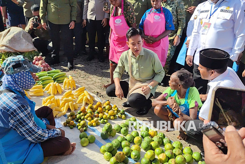 Wakil Presiden Gibran Rakabuming Raka berdialog dengan para pedagang di Pasar Wosi, Manokwari, Papua Barat, Rabu (5/11/2025). Dalam kunjungan kerjanya Gibran meninjau harga pangan sekaligus mendukung ekonomi rakyat dengan berbelanja di pasar tersebut. (FOTO : Republika/Alfian )
