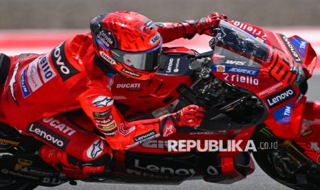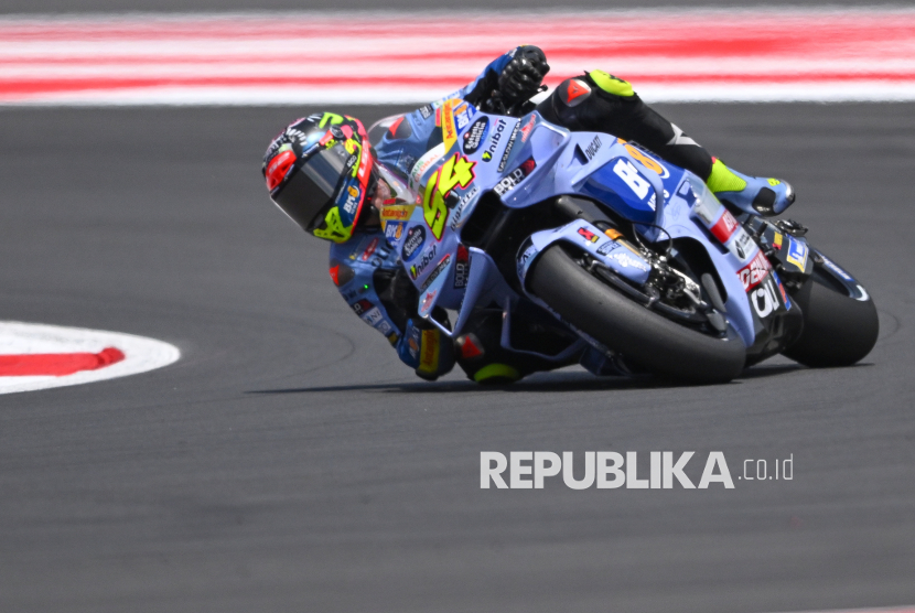 REPUBLIKA.CO.ID, MANDALIKA -- Pembalap Aprilia Racing Marco Bezzecchi memacu kecepatan sepeda motornya dalam sesi kualifikasi Q2 MotoGP Indonesia 2025 di Sirkuit Internasional Pertamina Mandalika, Lombok Tengah, Nusa Tenggara Barat, Sabtu (4/10/2025).