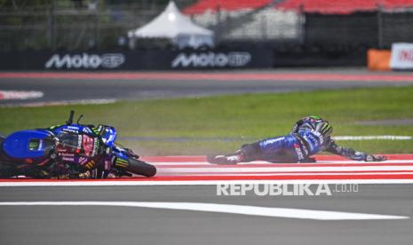 Pembalap Monster Energy Yamaha MotoGP Alex Rins terjatuh saat mengikuti sesi balapan kualifikasi Q2 MotoGP Indonesia 2025 di Sirkuit Internasional Pertamina Mandalika, Lombok Tengah, Nusa Tenggara Barat, Sabtu (4/10/2025). Dalam sesi tersebut pembalap Aprilia Racing Marco Bezzecchi meraih pole position atau tempat pertama dalam posisi start MotoGP Mandalika 2025 setelah menjadi yang tercepat dalam sesi kualifikasi Q2 dengan catatan waktu terbaiknya 1 menit 28,832 detik. (FOTO : ANTARA FOTO/Ahmad Subaidi)