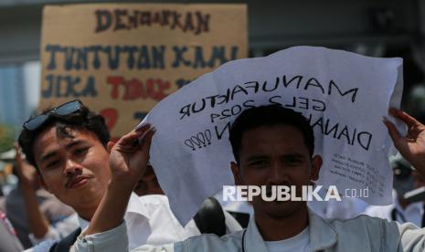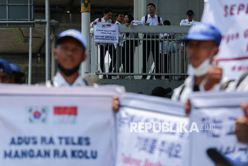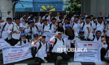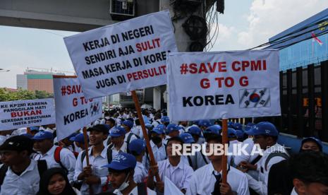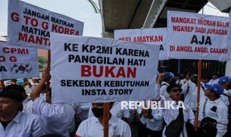 Calon Pekerja Migran Indonesia (CPMI) melakukan aksi di depan kantor Kementerian Perlindungan Pekerja Migran Indonesia (KP2MI), Jakarta, Senin (6/11/2025). Dalam aksinya, mereka menuntut kejelasan terkait keberangkatan CPMI dalam program goverment to goverment (G to G) ke Korea. Selain itu, mereka juga menuntut penerintah untuk menunjukan keseriusan dalam mengurai daftar tunggu yang dinilai menumpuk dan menghambat proses keberangkatan calon pekerja. (FOTO : Republika/Thoudy Badai)