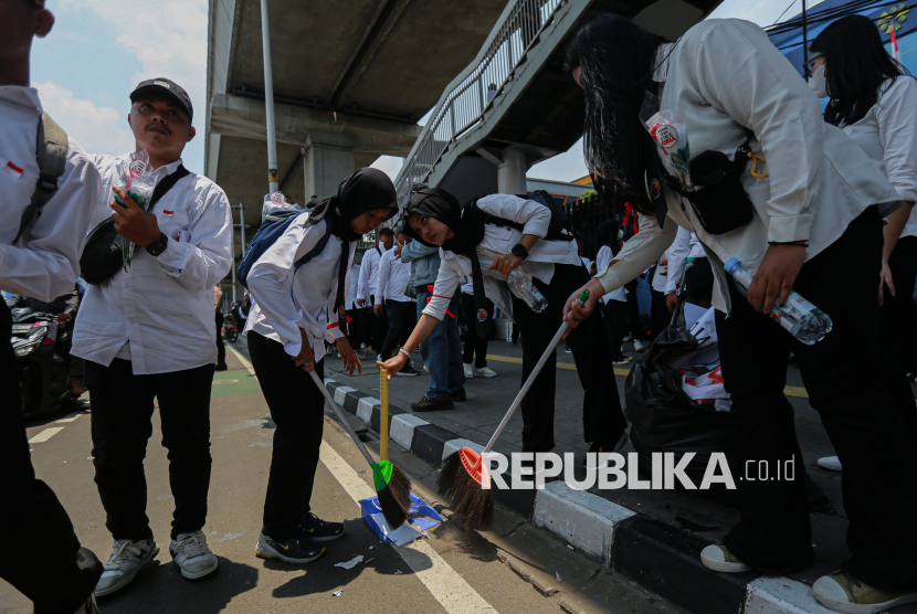 Calon Pekerja Migran Indonesia (CPMI) membersihkan lokasi aksi usai demonstrasi di depan kantor Kementerian Perlindungan Pekerja Migran Indonesia (KP2MI), Jakarta, Senin (6/11/2025). Dalam aksinya, mereka menuntut kejelasan terkait keberangkatan CPMI dalam program goverment to goverment (G to G) ke Korea. Selain itu, mereka juga menuntut penerintah untuk menunjukan keseriusan dalam mengurai daftar tunggu yang dinilai menumpuk dan menghambat proses keberangkatan calon pekerja. (FOTO : Republika/Thoudy Badai)