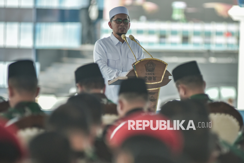 Ustaz Adi Hidayat memberikan tausiyah pada kegiatan doa bersama di Monas, Jakarta Pusat, Sabtu (4/10/2025). Doa bersama dihadiri sejumlah tokoh lintas agama, warga, anak yatim piatu dan Prajurit TNI dalam rangka HUT TNI ke-80 tahun. (FOTO : ANTARA FOTO/Fakhri Hermansyah)